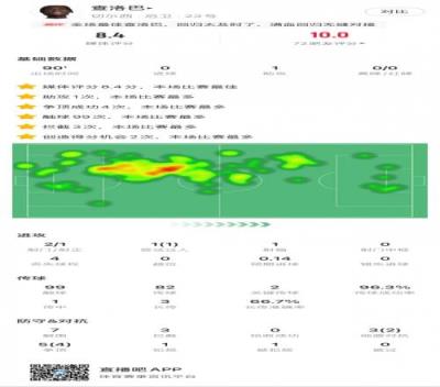 回归之战!查洛巴全场1次助攻,7次解围,3次拦截,评分8.4最高