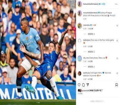 赛后阿坎吉更新ins,一共有三张配图,其中两张为恩佐和自己对抗倒地的照片,还有一张是自己和队友迪亚斯的同框照。