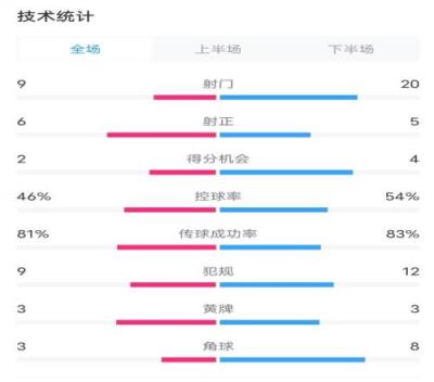 热刺43曼联全场数据:射门920,射正65,控球率46%54%