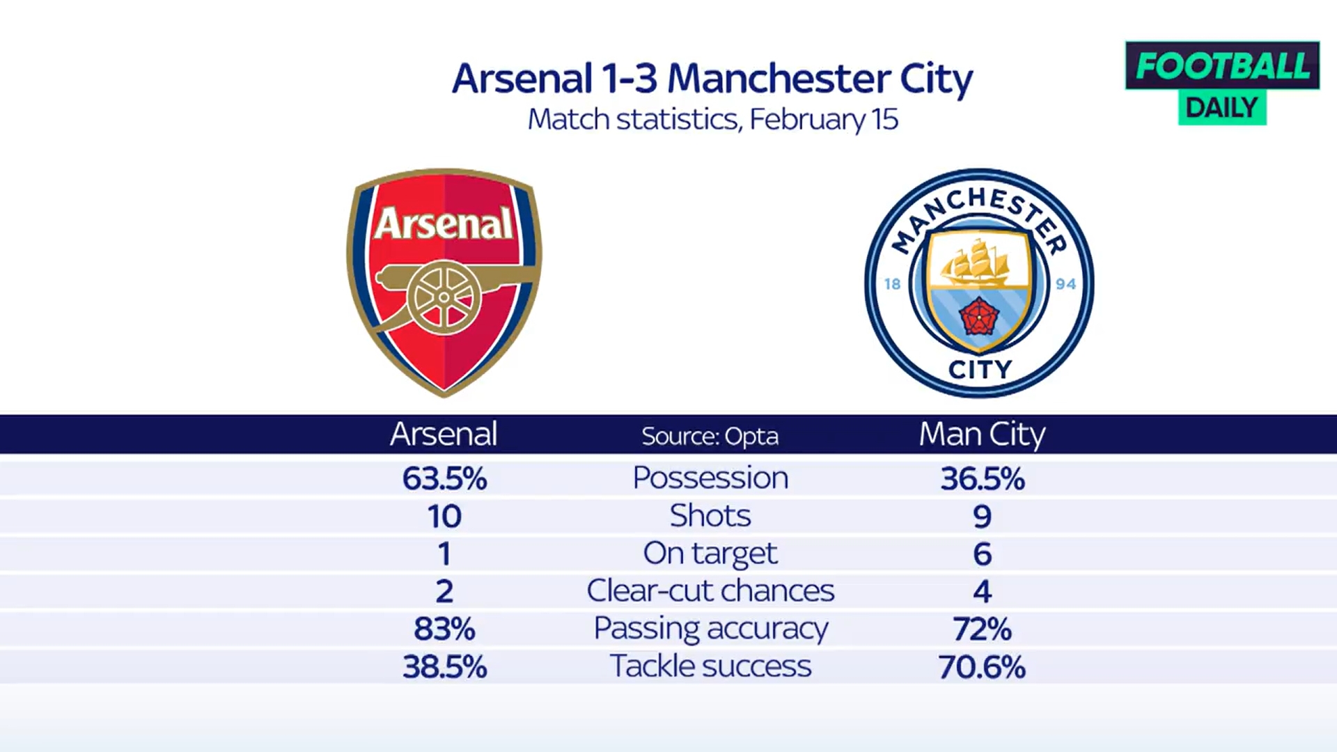 天空体育盘点了两队上一次交锋的数据,在今年2月份的英超比赛中,曼城客场3比1击败阿森纳。