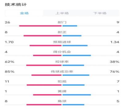 切尔西21布伦特福德数据:射门269,射正84,控球率62%38%