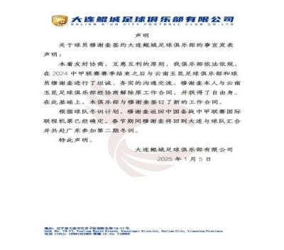 体育资讯01月05日报道宣称 大连鲲城官方发布声明解释有关穆谢奎签约的争议问题,球队表示穆谢奎本人与云南解约才自由身加盟球队,并签订合同,球员将在春节期间回到大连与球队汇合并参加冬训。