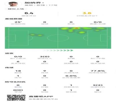 加纳乔本场替补数据:0射0关键传球,3过人0成功,获评6.4分