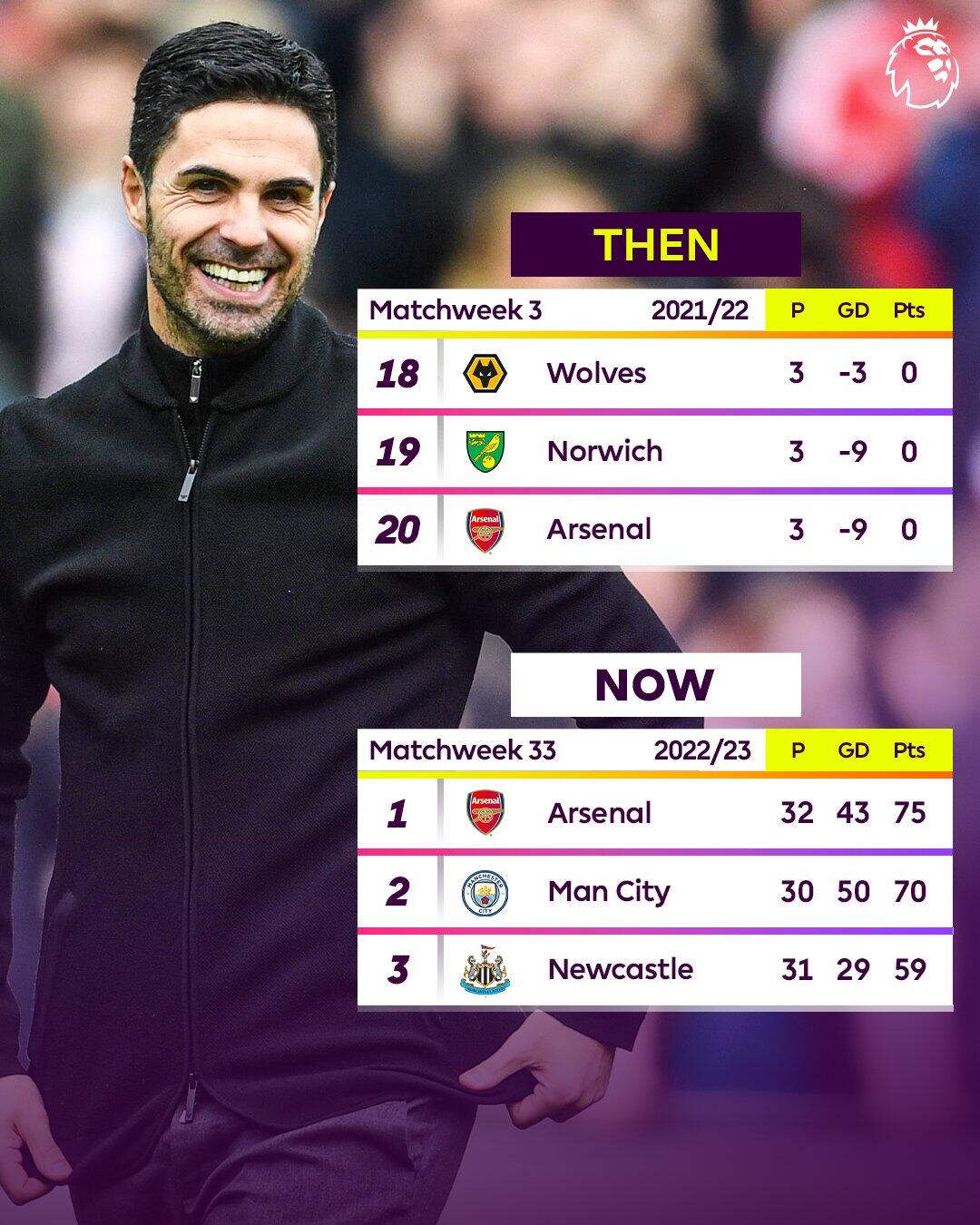 4月25日讯 英超本赛季天王山之战,排在第一的阿森纳将客战排在第二的曼城。而在上赛季,阿森纳客战曼城时遭遇了0-5的惨败,并且是英超开局三连败&积分榜垫底。
