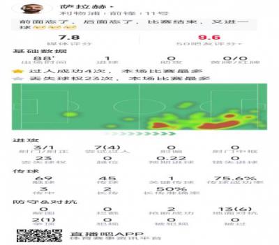萨拉赫本场数据:1粒进球,3射1正,4次成功过人,评分7.8分