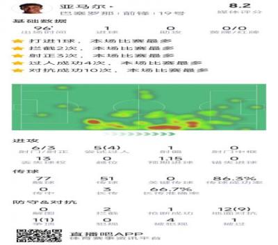 体育资讯1月30日报道宣称 在本轮欧冠,巴萨2-2战平亚特兰大,亚马尔打进一球,以下为他在本场数据: