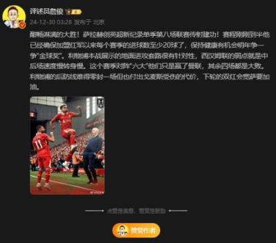 体育资讯12月30日报道宣称 本轮英超,利物浦5-0大胜西汉姆联,赛后,评述员詹俊在个人社媒做出点评。
