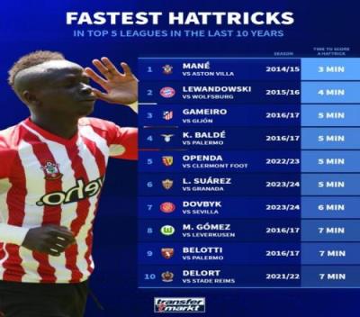 五大联赛近10年最快帽子戏法榜:马内3分钟3球第一,莱万神迹次席