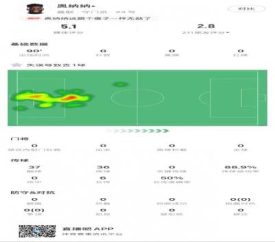 奥纳纳本场数据:0次扑救,1次失误致丢球,媒体评分5.1最低