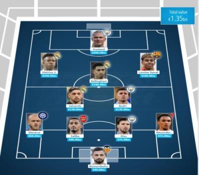 姆总继续缺席!足坛最贵阵:2亿欧哈兰德+维尼修斯,亚马尔替福登