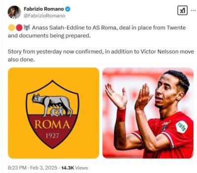 体育资讯2月3日报道宣称 罗马诺报道,23岁左后卫萨拉赫-埃丁将加盟罗马,交易文件正在准备中。