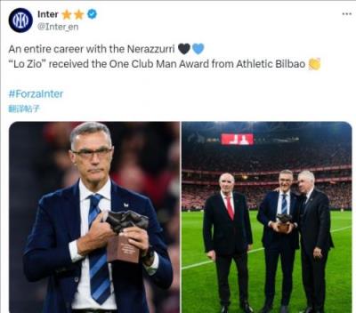 表彰忠诚!国米官方:贝尔戈米领取毕巴“一人一城”奖