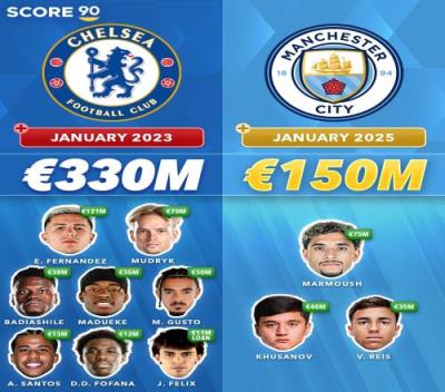 1.切尔西:2023年冬窗花费3.3亿欧,签下恩佐、穆德里克、巴迪亚西勒、马杜埃凯、古斯托、桑托斯、福法纳、菲利克斯