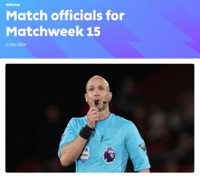 体育资讯12月6日报道宣称 英超官方公布第15轮联赛各场执法裁判,奥利弗执法默西塞德德比,安东尼-泰勒执法热刺vs切尔西。