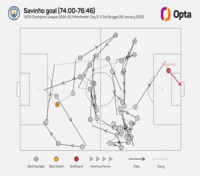 数据统计显示,萨维尼奥的进球在此前经历了曼城球员的42次传导,是有统计(03-04赛季)以来欧冠传导次数最多的进球。