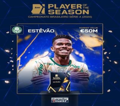 17岁的埃斯特旺上赛季为帕尔梅拉斯出战31场巴甲比赛,打进13球,助攻9次,德国转会市场官方社媒晒出海报,确认他当选德转巴甲2024赛季最佳球员。