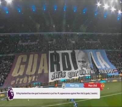 体育资讯12月16日报道宣称 本轮英超曼市德比焦点战,曼城主场对阵曼联的比赛正在进行。赛前,曼城主场球迷打出了巨幅TIFO,致敬功勋教练瓜迪奥拉。