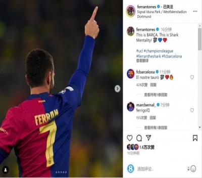 费兰-托雷斯在社交媒体上晒出庆祝进球的照片,并写道:“这就是巴萨,这就是鲨鱼心态。”