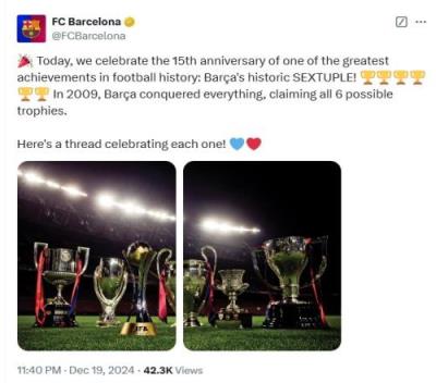 巴萨官方表示道:今天,我们庆祝足球史上最伟大的成就之一的15周年纪念——巴萨在2009年达成了历史性的6冠王成就