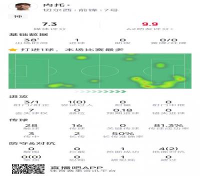 替补登场改变战局,内托本场数据:1粒进球,3射1正