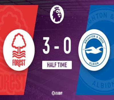 上半场比赛结束,诺丁汉森林3-0布莱顿。