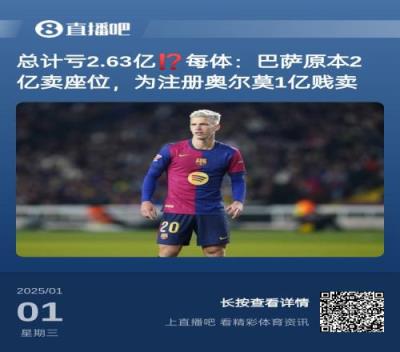 体育资讯01月04日报道宣称 西甲联赛和西班牙足协联合声明,拒绝维巴萨注册奥尔莫。而根据1月1日《每日体育报》计算,如果奥尔莫自由身离开巴萨,巴萨相当于亏了2.63亿欧元。