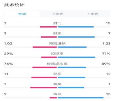 莱斯特城11热刺数据:射门715,射正37,控球率29%71%