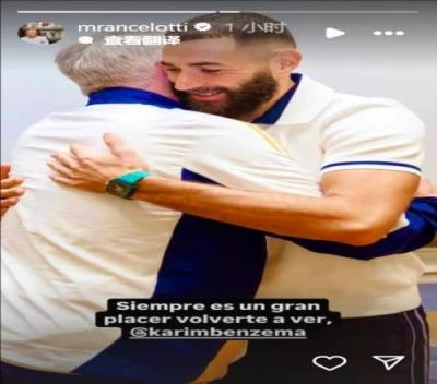 在个人社媒,安切洛蒂晒出他与本泽马拥抱的照片,并且配文:“很高兴再次见到你”。现年37岁的本泽马在皇马效力14年,与安切洛蒂一起赢得过多项荣誉。