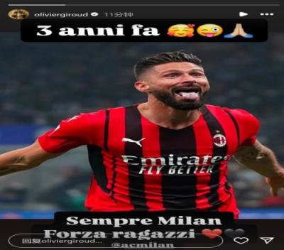 吉鲁在社交媒体上晒出自己当时庆祝进球的照片,配文:“三年前。永恒的米兰,加油兄弟们!”