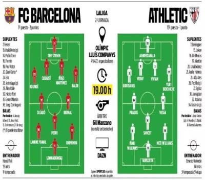 体育资讯8月24日报道宣 巴萨周末将坐镇主场迎战毕尔巴鄂竞技,《每日体育报》预测了两队首发。