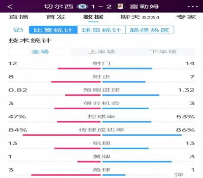 遭逆转绝杀,切尔西12富勒姆全场数据:射门1214,射正87