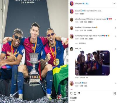赛后巴萨官方晒出前场三叉戟莱万、拉菲尼亚、亚马尔合照,配文:世界最佳三叉戟。