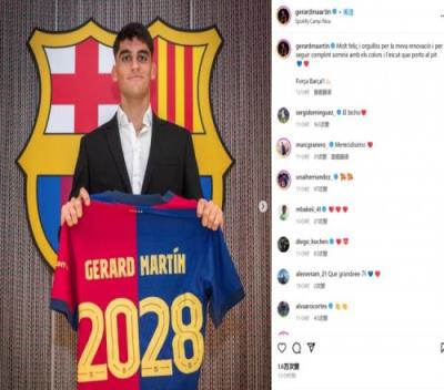 杰拉德-马丁也通过社媒晒出自己手持印有2028字样的巴萨球衣照,并配文:“我对自己能够获得续约合同感到非常自豪和高兴,将继续捍卫胸前的红蓝队徽并实现梦想。”