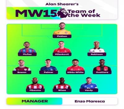 希勒评英超第15轮最佳阵容:帕尔默、瓦尔迪在列,主帅马雷斯卡