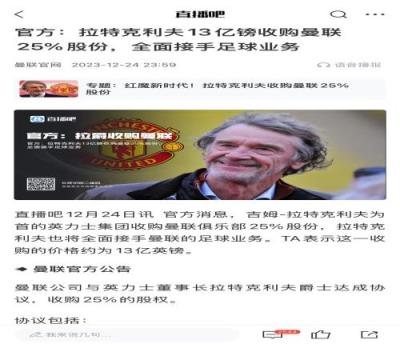 体育资讯12月24日报道宣称 一年前的今天,曼联官方发布公告,吉姆-拉特克利夫为首的英力士集团收购曼联俱乐部25%股份,拉特克利夫也将全面接手曼联的足球业务。TA表示这一收购的价格约为13亿英镑。