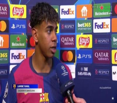体育资讯12月12日报道宣称 在欧冠第6轮比赛中,亚马尔助攻费兰攻入制胜进球,帮助巴萨客场3-2击败多特,赛后亚马尔接受了媒体的采访。