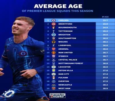 英超阵容平均年龄:切尔西23.7岁最年轻,曼联26.7岁&曼城27.3岁