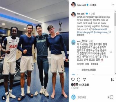 热刺队长孙兴慜赛后在社交媒体上晒出与三位破门青训小将的合照,配文:“对于我们的青训学院和俱乐部来说,这是一个多么特别的夜晚!这么多人的辛勤工作有了成果。对此只有骄傲!”