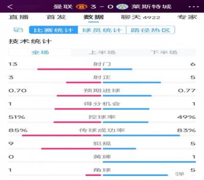 体育资讯11月10日报道宣称 在本轮英超,曼联3-0大胜莱斯特城。以下为双方全场数据对比: