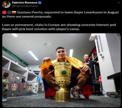 体育资讯8月3日报道宣 据知名转会专家罗马诺报道,哥伦比亚中场古斯塔沃-普埃塔预计将在八月份离开勒沃库森,球员已经收到了多份报价。