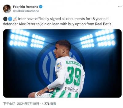 罗马诺指出,国米已经正式签署所有交易文件,以租借加选择买断的方式签下了贝蒂斯18岁中卫亚历克斯-佩雷斯。