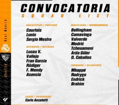 皇马对阵塞维利亚大名单:姆巴佩&贝林厄姆领衔,维尼修斯缺席