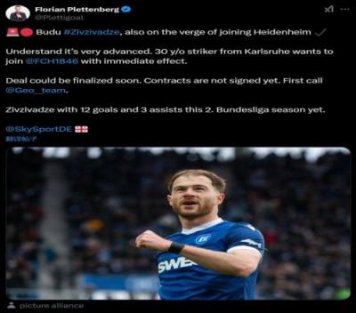 普莱滕贝格报道称,齐夫齐瓦泽接近加盟海登海姆,谈判已非常深入,这位前锋想立即加入海登海姆,交易可能很快完成,但合同尚未签署。