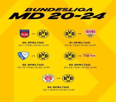 体育资讯12月19日报道宣称 多特蒙德今天公布了球队德甲第20轮至第24轮的比赛时间,具体如下: