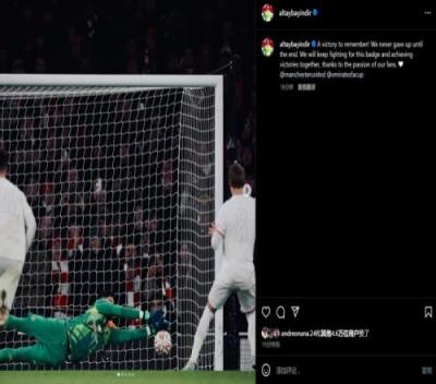 体育资讯1月13日报道宣称 足总杯第三轮,十人作战的曼联通过点球大战淘汰阿森纳,巴因德尔常规时间和点球大战各扑出1次点球,且贡献多次关键扑救。赛后,他更新了社媒,庆祝获胜。