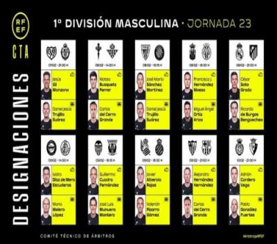 赛前西甲官方公布了本轮各场比赛的裁判安排。格拉多将会执法马德里德比,而塞维利亚主场迎战巴萨的主场是埃尔南德斯-埃尔南德斯。