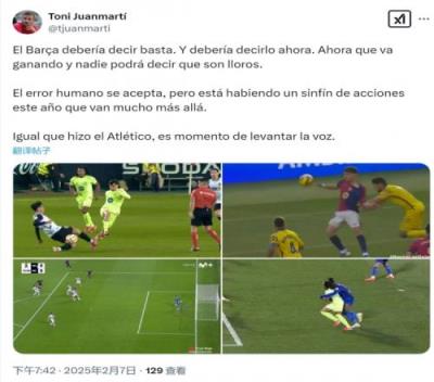 “巴萨应该说‘够了’,他们现在就应该说出来,现在他们正在赢球,没有人会因此说他们在哭泣。人的失误是可以接受的,但本赛季有数不清的情况远不止于此。正如马竞所做的那样,是时候发出我们的声音了。”