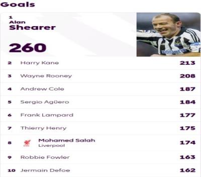 英超历史总射手榜:萨拉赫再进2球超越亨利,再进4球超兰帕德