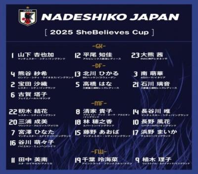 日本女足将在本月21日至27日在美国参加SheBelieves(她相信)杯国际足球邀请赛,参赛球队还有东道主美国女足、澳大利亚女足和哥伦比亚女足。日本女足本期大名单如下: