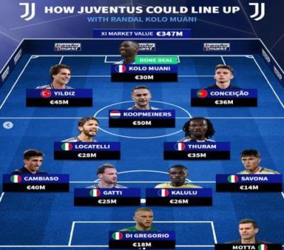 德转预测尤文主力阵:穆阿尼、伊尔迪兹、孔塞桑三叉戟